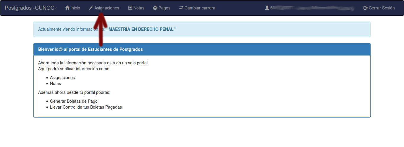 3. Una vez dentro de su portal deberá buscar el menú "Asignaciones"