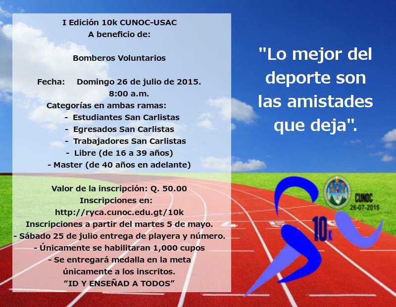 Se invita a toda la población a participar de la carrera 10k Cunoc, a beneficio de los Bomberos Voluntarios.