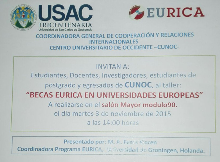 Se informa a toda la población de Postgrados interesados en optar a una Beca en Europa, sobre la actividad Becas EURICA Que se llevará a cabo el día martes 3 de noviembre a partir de las 14:00 horas en el Salon Mayor del Módulo 90.