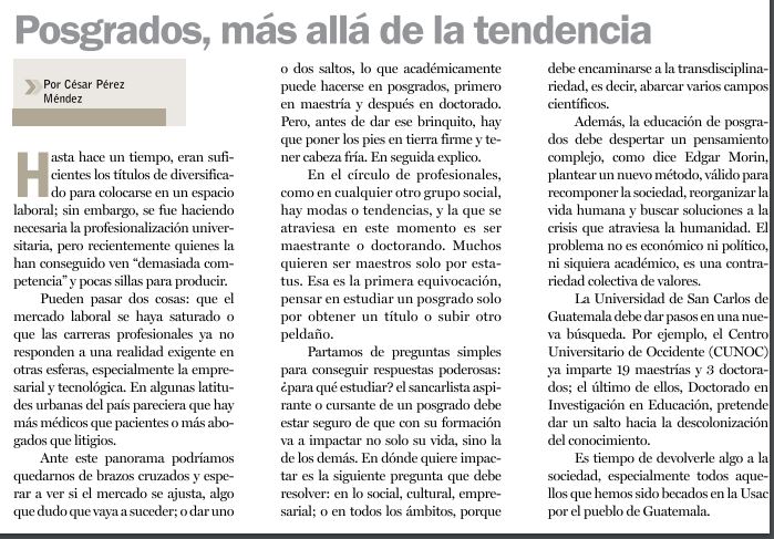 El actual doctorando Lic. César Pérez Méndez realizó una opinión sobre los Postgrados, aplicando un enfoque específico sobre los Postgrados que ofrece el CUNOC y el Doctorado en Investigación en Educación que actualmente cursa.