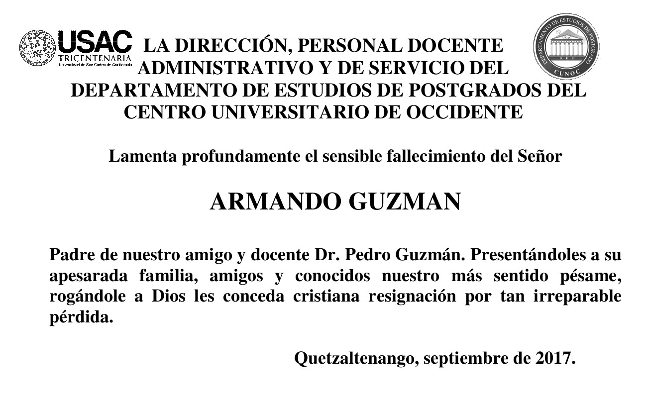 El Departamento de Estudios de Postgrado del Centro Universitario de Occidente Lamenta profundamente el sensible fallecimiento del Señor ARMANDO GUZMAN Padre de nuestro amigo y docente Dr. Pedro Guzmán.