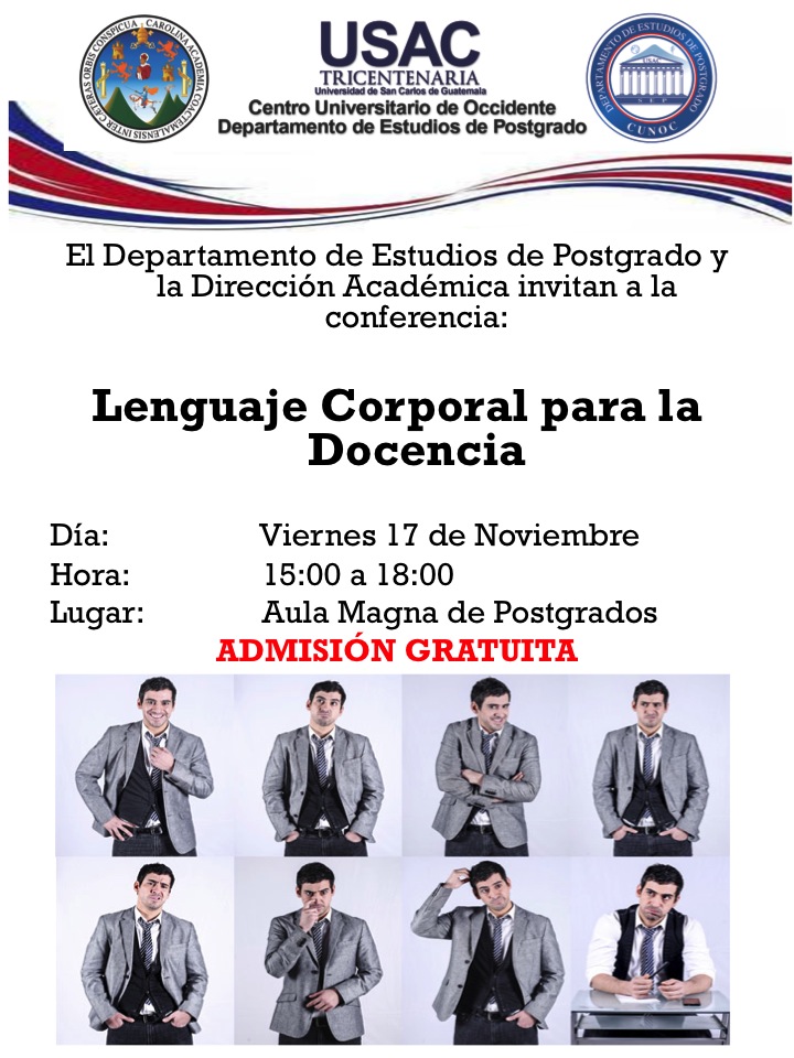 El Departamento de Estudios de Postgrado y la Dirección Académica del CUNOC invitan a la conferencia Lenguaje Corporal en la Docencia a realizarse el viernes 17 de noviembre de 15 a 18 horas
