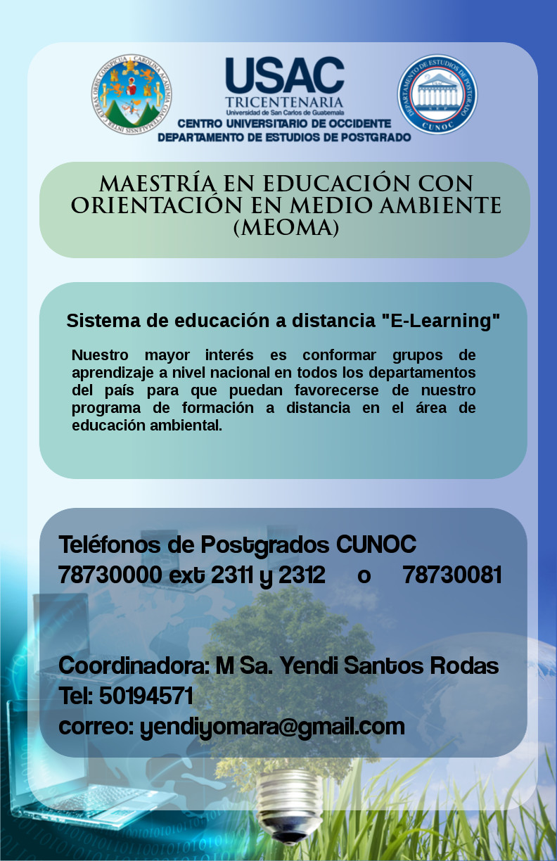 Estas interesado en una Maestría Virtual, El Departamento de Estudios de Postgrados se alegra en informarles que tenemos disponible la Maestría en Educación con Orientación en Medio Ambiente, la cual será con metodología E-Learning (virtual) informaté más en nuestro afiche.