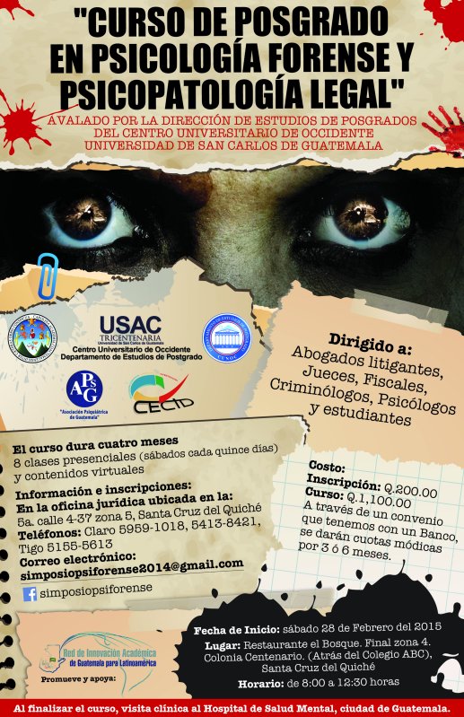 Invitados a Inscribirse al Curso de Psicología Forense a realizarse en Santa Cruz del Quiché. Mayor información en el afiche