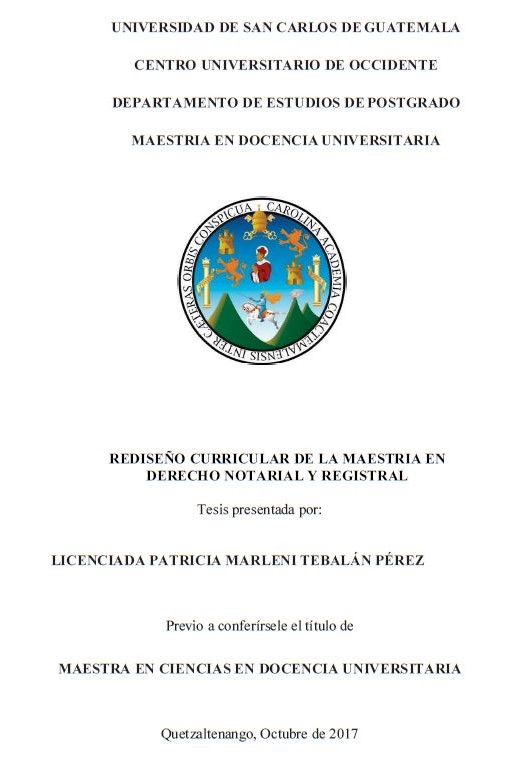 El Sistema de Estudios de Postgrados de la Universidad de San Carlos de Guatemala, analizó la necesidad de realizar una autoevaluación en las diferentes maestrías del departamento de estudios de postgrados del Centro Universitario de Occidente, siendo la cohorte 2014-2015 de la Maestría en Docencia Universitaria la responsable de llevarla a cabo. Dentro del estudio se visualizaron varias dimensiones, entre las que más repercutió para un profundo análisis fue la dimensión 4 que trató sobre la Estructura Curricular, media vez realizada la autoevaluación, se trabajó el rediseño curricular de la Maestría en Derecho Mercantil.REDISEÑO CURRICULAR DE LA MAESTRIA EN DERECHO NOTARIAL Y REGISTRAL