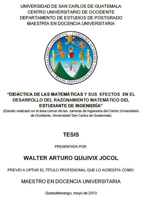 El método de investigación compara la opinión de dos grupos de informantes: el primero integrado por estudiantes de matemática de los dos primeros años de la carrera de Ingeniería y el segundo grupo conformado por los profesores de matemáticas. Para ello se analizaron los casos de la didáctica aplicada por profesores en la impartición de los cursos de matemática I y II, matemática intermedia I y matemática V y VI, de los primeros dos años de las carreras de Ingeniería Civil, Industrial, Mecánica y Mecánica Industrial del Centro Universitario de Occidente. El universo utilizado fue 990 estudiantes, inscritos en los cursos mencionados para el año 2012, en función de dicho universo se estructuró una muestra estratificada simple con un nivel de confianza del 90% y una cota de error de la muestra estratificada del 10%.DIDÁCTICA DEL CURSO DE DISEÑO ARQUITECTÓNICO Y SU IMPACTO EN EL APRENDIZAJE DEL ESTUDIANTE DE ARQUITECTURA DEL CUNOC