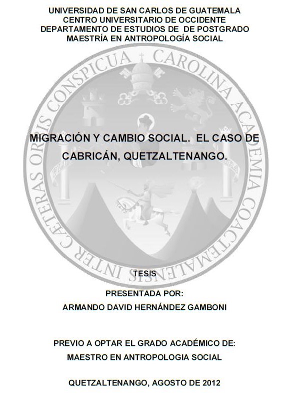 La investigación se realizó en el municipio de Cabricán que se encuentra en el Occidente de Guatemala, muy cerca de la frontera con México. El autor considera que este estudio de caso es una importante experiencia de contraste y comparación que aporta elementos para comprender la pauta del cambio social impulsado por la migración internacional en Guatemala y la forma en que distintas sociedades territoriales se recomponen a partir de una amplia gama de estrategias familiares y permite entender la dinamicidad y complejidad del género humano en el marco de la sociedad y la cultura a la que pertenece y verlo como producto de estas que en último caso es una de las finalidades últimas de la Antropología Social, cuyo objeto de estudio es la humanidad vista como un todo.MIGRACIÓN Y GLOBALIZACIÓN ASPECTOS CONTEMPORÁNEOS DE LA IDENTIDAD EN EL CASERÍO EL TIGRE Y CANTÓN MARROQUÍN, MUNICIPIO DE SALCAJÁ