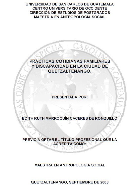 Esta es una investigación donde se hace un esbozo del fenómeno del Movimiento de Renovación Carismática Católica y la gran tarea de la Antropología Social que propicia espacios de lectura y reflexión del hombre en la sociedad, de sus instituciones y de todo aquel hecho o fenómeno que se suscite alrededor de su vida. Mientras me adentraba en los estudios iba surgiendo la inquietud precisamente de analizar y reflexionar el rol de la persona y el poder dentro de la religión, sus contradicciones sus espacios, sus particulares formas de manejo de los espacios físicos e intelectuales; los antropólogos por años han estudiado el fenómeno religioso desde distintas vertientes, una de las cuales ha sido el poder y la religión. Por supuesto que hablar de poder y religión en contextos académicos aún hoy en día es un tema tabú. La religión pareciera ser un tema aparte sobretodo en una sociedad eminentemente religiosa.PRÁCTICAS COTIDIANAS FAMILIARES Y DISCAPACIDAD EN LA CIUDAD DE QUETZALTENANGO