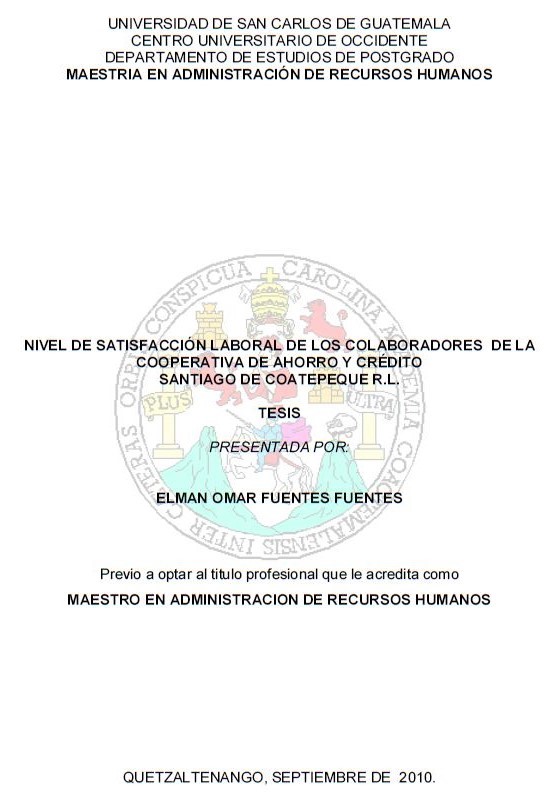 En vista que, la gestión del desempeño es una herramienta integral y objetiva para la búsqueda de factores críticos que puedan ser una amenaza para el alcance de mejoras cualitativas y cuantitativas en la meta de una Institución. Y con la firme decisión de la Empresa Eléctrica Municipal de Quetzaltenango por cambiar paradigmas para medir el rendimiento del personal y decidir de manera objetiva como capacitar y desarrollar al mismo, surge la necesidad de llevar a cabo la investigación titulada: “La Gestión Del Desempeño en la Empresa Eléctrica Municipal de Quetzaltenango –EEMQ-, como Herramienta de Detección de Necesidades de Capacitación y Desarrollo, la cual profundiza en el análisis de la medición de desempeño y en la utilización de la gestión del desempeño como instrumento para realizarla y detectar las necesidades de capacitación y desarrollo.NIVEL DE SATISFACCIÓN LABORAL DE LOS COLABORADORES DE LA COOPERATIVA DE AHORRO Y CRÉDITO SANTIAGO DE COATEPEQUE R.L.
