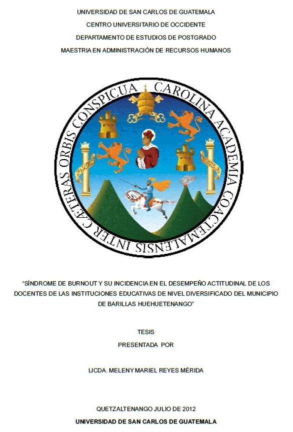 Un fenómeno se está suscitando en la mayoría de las instituciones dirigidas por el gobierno y, éste es que, se presta mal servicio al usuario; las personas que ocupan los puestos, son dueños de estos y, no están orientados a prestar un servicio y una atención de calidad al usuario sino satisfacer las necesidades propias y, muchas veces, cumplir con jornadas laborales resulta todo un sacrificio, a pesar que dichas jornadas son de 8 horas, a diferencia de las personas que trabajan para empresas u organizaciones privadas que pasan casi 12 horas dentro del trabajo. Esta investigación tiene el propósito de analizar problemas ya sean científicos, técnicos, sociales, culturales, etc., y así poder definir una solución factible; en la investigación se aplica un análisis y estudio a través de métodos, procedimientos y técnicas adecuadas.SÍNDROME DE BURNOUT Y SU INCIDENCIA EN EL DESEMPEÑO ACTITUDINAL DE LOS DOCENTES DE LAS INSTITUCIONES EDUCATIVAS DE NIVEL DIVERSIFICADO DEL MUNICIPIO DE BARILLAS HUEHUETENANGO