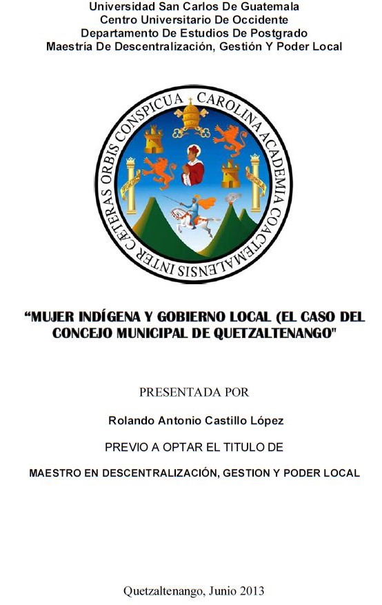 El presente trabajo de tesis para optar al grado académico de maestro en Descentralización, Gestión y Poder Local, titulado: “MUJER INDÍGENA Y GOBIERNO LOCAL (EL CASO DEL CONCEJO MUNICIPAL DE LA CIUDAD DE QUETZALTENANGO)" no pretende ser una descripción institucionalista desde el Concejo Municipal, sino que persigue abordar, en forma científica, profunda y critica como algunas organizaciones políticas y comité cívico Xel-jù han potenciado espacios de participación a la mujer maya del municipio de Quetzaltenango, a su vez, la incidencia del trabajo político administrativo que han desarrollado las que lograron llegar a ser parte del Concejo Municipal, cuyas luchas políticas se inscriben en el campo individual y grupal.