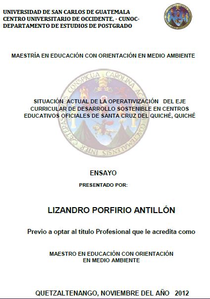 En la actual debacle en que el mundo pierde los recursos ambientales que son base de la vida humana y motivo de su historia, el tema ambiental no es una opción a tratar si no es un tema intrínseco de subsistencia para nuevas generaciones. El nuevo paradigma educativo guatemalteco hace referencia a los temas medioambientales, estableciéndolos como ejes prioritarios a alcanzar, convirtiéndose en un tema muy discutido que plantea grandes retos para la formación de los nuevos ciudadanos guatemaltecos. La Educación Ambiental constituye una herramienta fundamental para que las personas adquieran conciencia de su entorno y puedan realizar cambios en sus valores, conductas y estilos de vida, además de poder ampliar sus conocimientos para impulsar los procesos de prevención y resolución de los problemas ambientales presentes y futuros.AMBIENTALIZACIÓN CURRICULAR DE LA CARRERA DE BACHILLERATO EN CIENCIAS Y LETRAS EN GUATEMALA